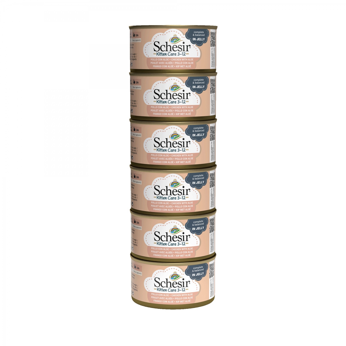 Aliment complémentaire naturel pour chaton de 3 à 12 mois, en gelée - pack de 6 boites de 85g SCHESIR La recette est à base de vrais filets de poulet finement hachés, enrichis d'une garniture à l'aloès, une plante connue pour ses vertus bienfaisantes. Un petit ajout d’huile végétale apporte des acides gras oméga. La préparation est en gelée, pour une consistance délicieuse et plus compacte dans la gamelle. Le produit est complet et équilibré, idéal pour les chatons en pleine croissance de 3 à 12 mois.