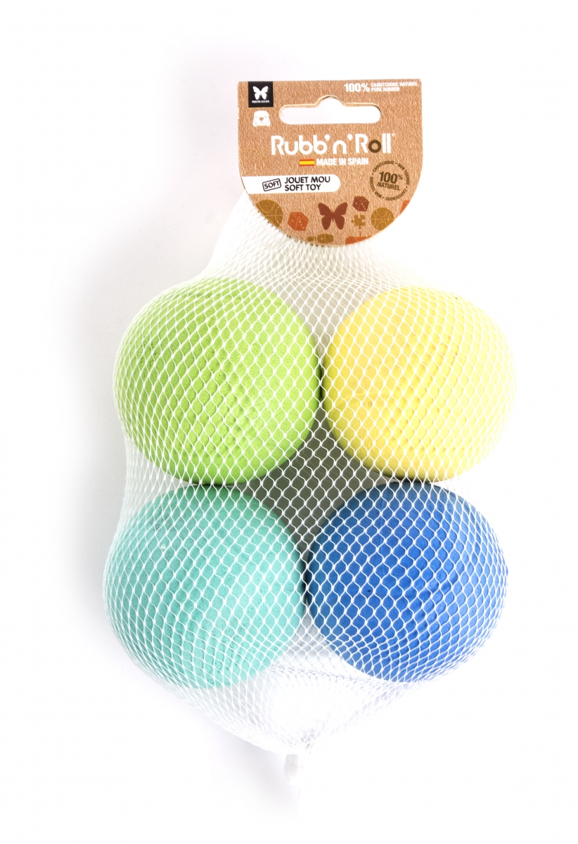 Filet avec 4 balles Rubb'N'Soft en caoutchouc naturel Hévéa pour chien. Prévient les occlusions intestinales. Biodégradable.