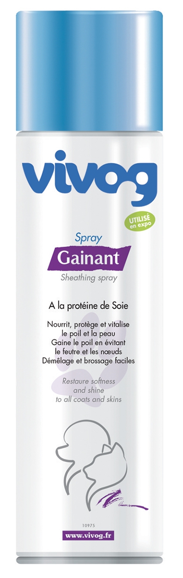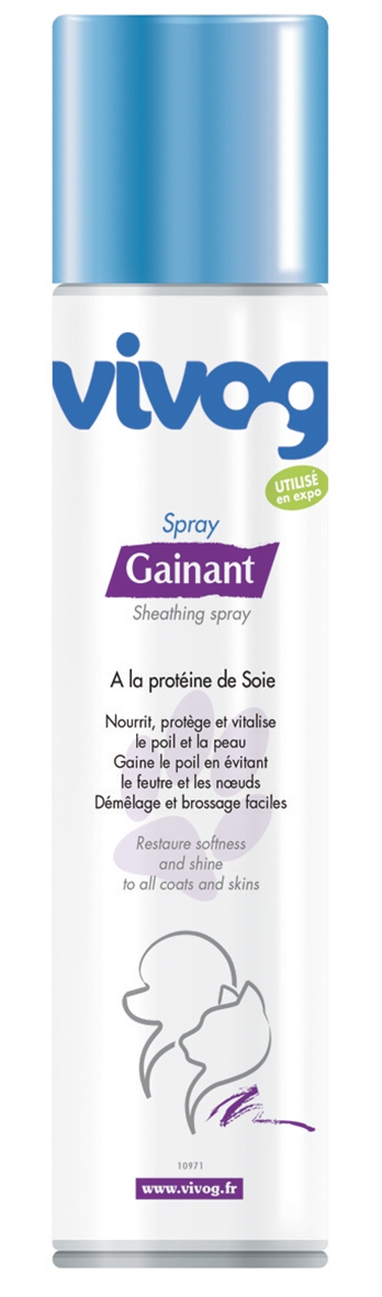Le spray Gainant Vivog enrichi en vitamine F et en proteine de soie, nourrit, protège et vitalise le poil et la peau. Gaine le poil en évitant le feutre et les noeuds. Démêlage et brossage faciles. Il redonne éclat et brillance à la fourrure et favorise la pousse du poil.