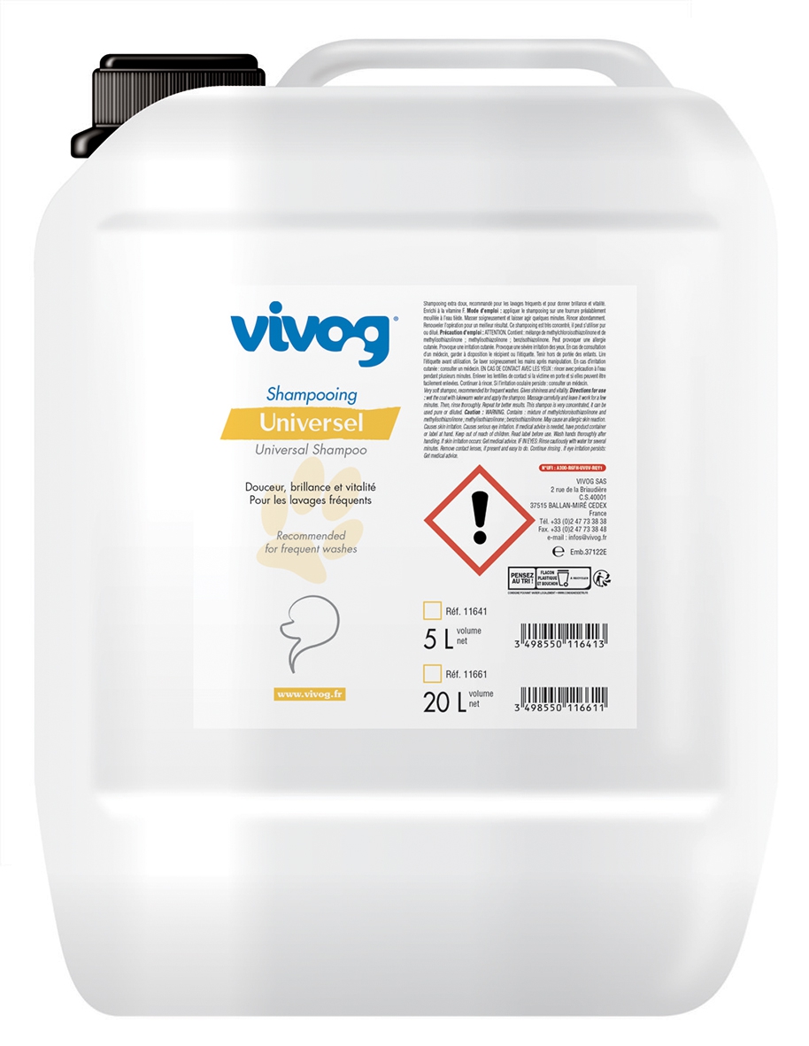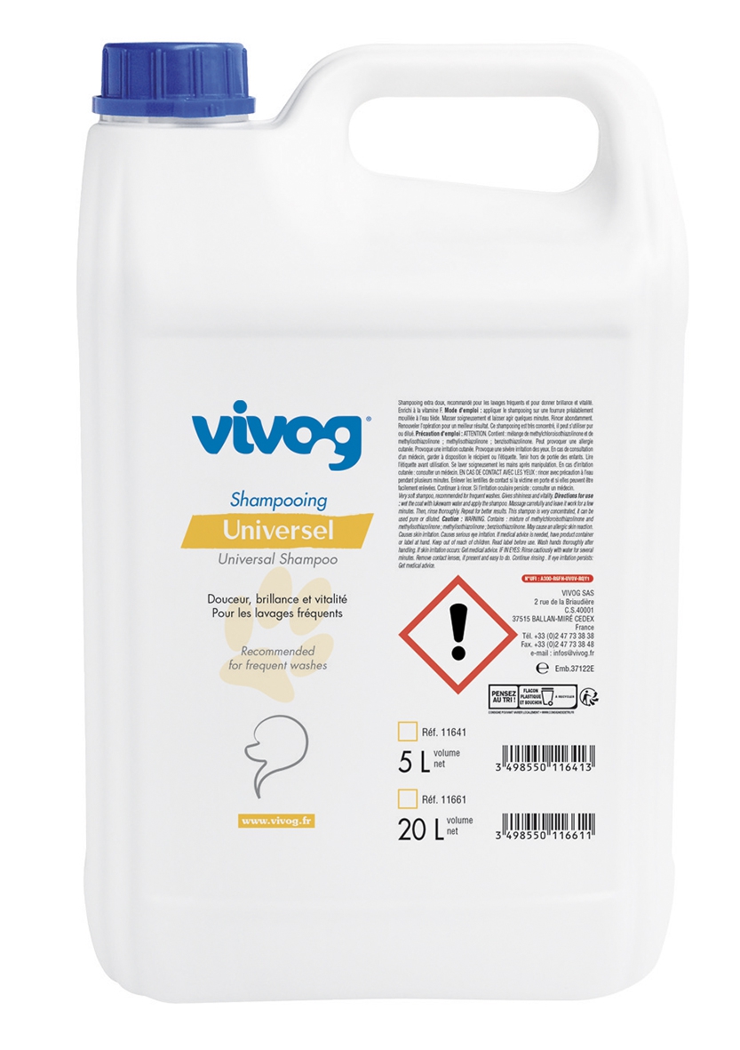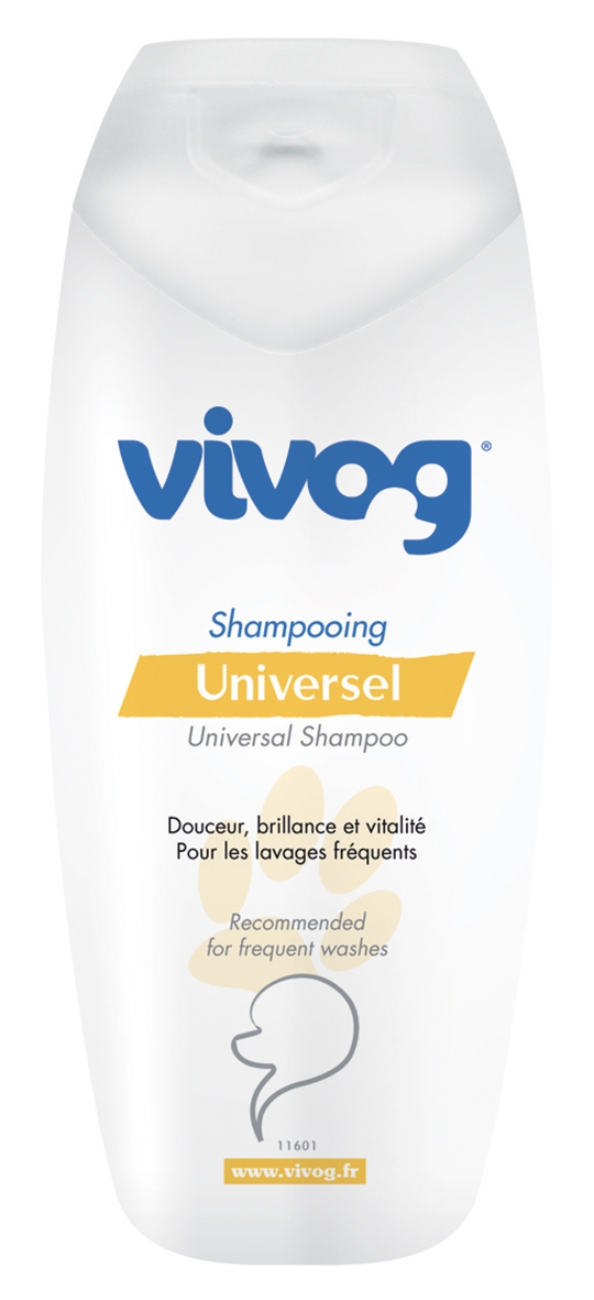 Le shampooing chien Vivog universel apporte brillance et vitalité pour tous types de poil et toutes races de chien. Lavages fréquents. Extra doux. Sans paraben. Odeur agréable. A l'acide gras d'huile de Lin.
