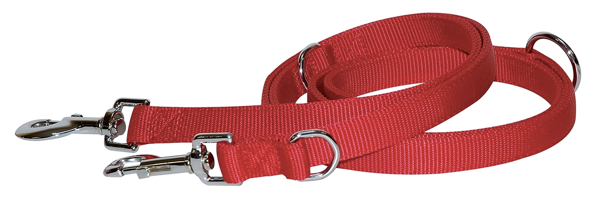 Laisse 3 positions pour chien. Position A : Laisse 1 chien (2 longueurs possibles court ou long). Position B : Laisse 2 chiens. Position C : Laisse autour du maitre - autourd'un poteau.