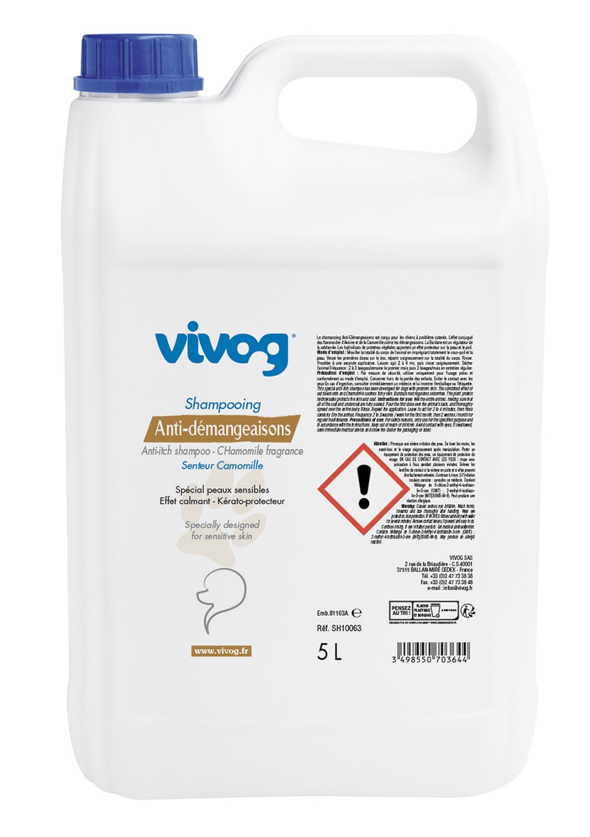Le shampoing chien Vivog Anti-démangeaison est Kérato-protecteur. Effet calmant. Calme les démangeaisons. Sans paraben. A l'huile de camomille