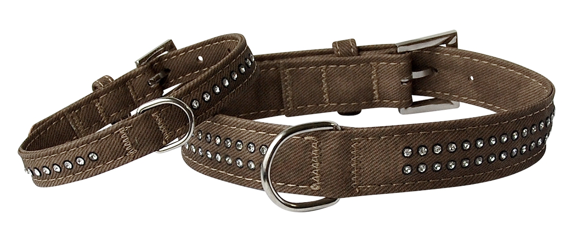 Collection fantaisie, très belle finition, collier et laisse double piqués, réhaussés de strass, boucle métal.