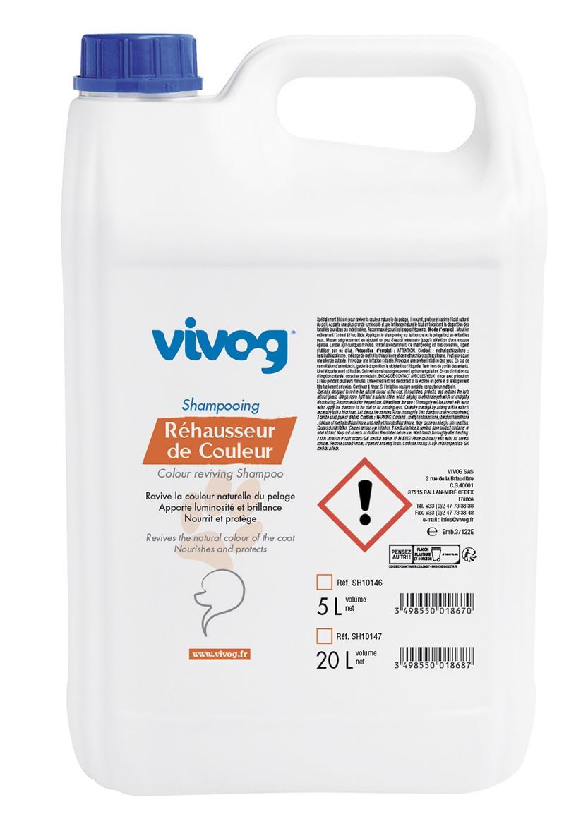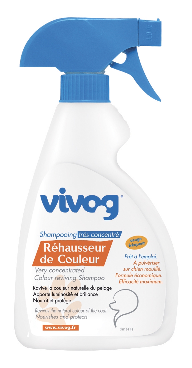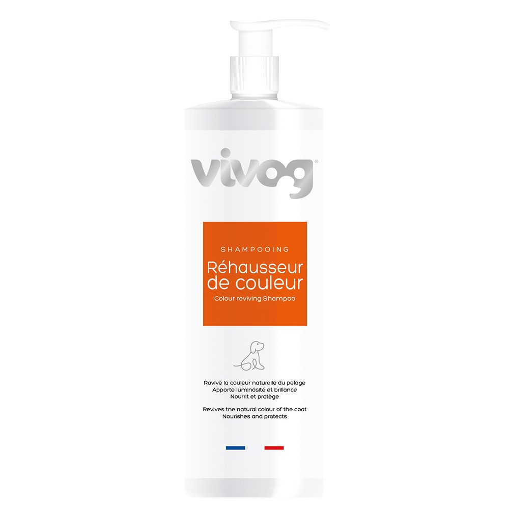 Le shampooing chien Réhausseur de couleurs Vivog est un concentré nutri-réhausseur. Ravive la couleur naturelle du pelage. Nourrit et protège. Donne luminosité et brillance. Sans paraben.